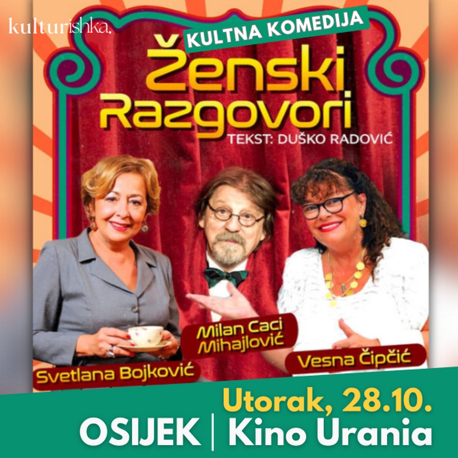 Tri velika glumačka imena — Svetlana Ceca Bojković, Vesna Čipčić i Milan Caci Mihailović — izvest će u utorak, 28.10. u Osijeku, u kinu Urania kultnu komediju Ženski razgovori, nastalu po tekstovima velikog Duška Radovića.